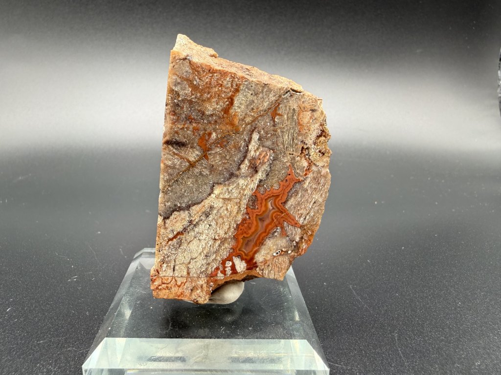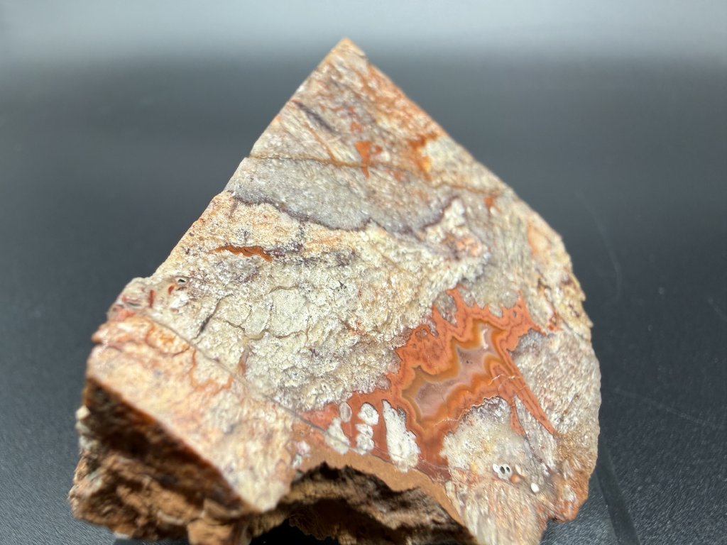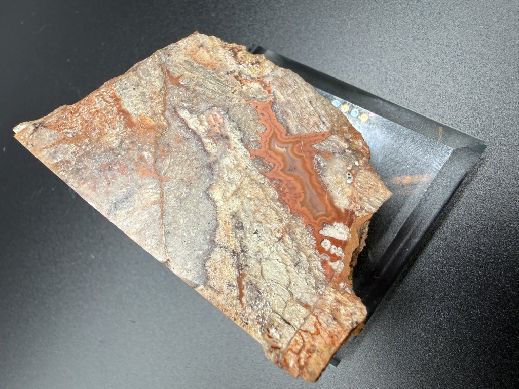 Leštěný vzorek achátu z Mýtinky z Krušných hor. Vzorek má spodní část oddělenou řezem.