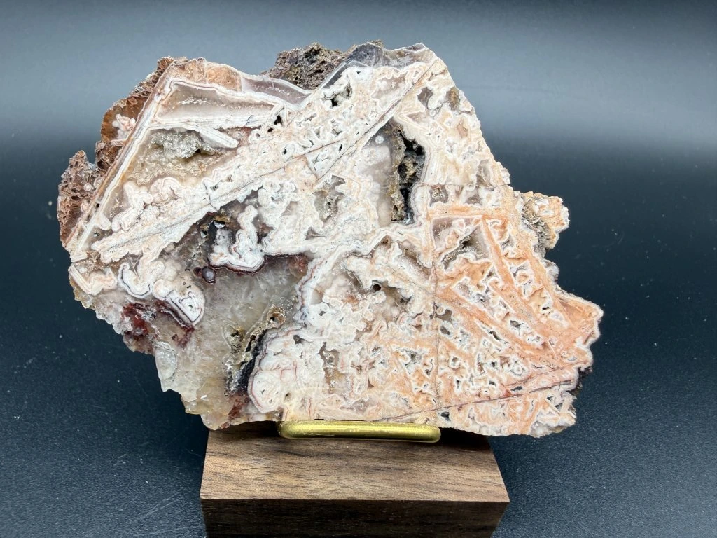 Leštěný vzorek perimorfózy po lištovitých minerálech z lokality Mýtinka.