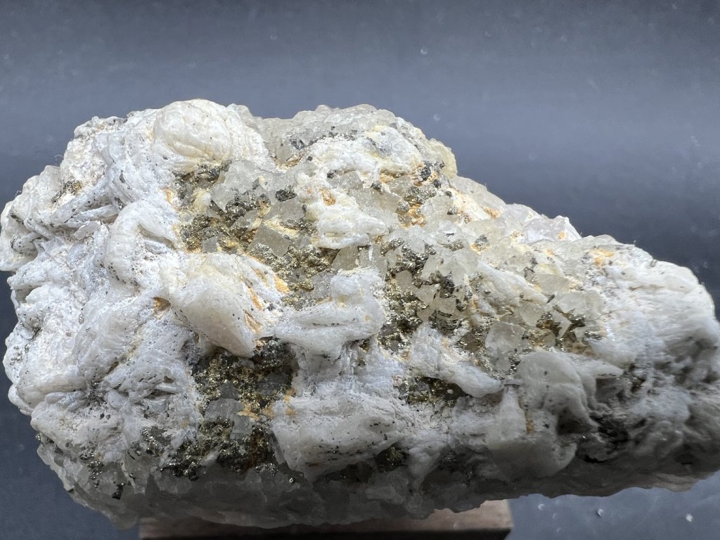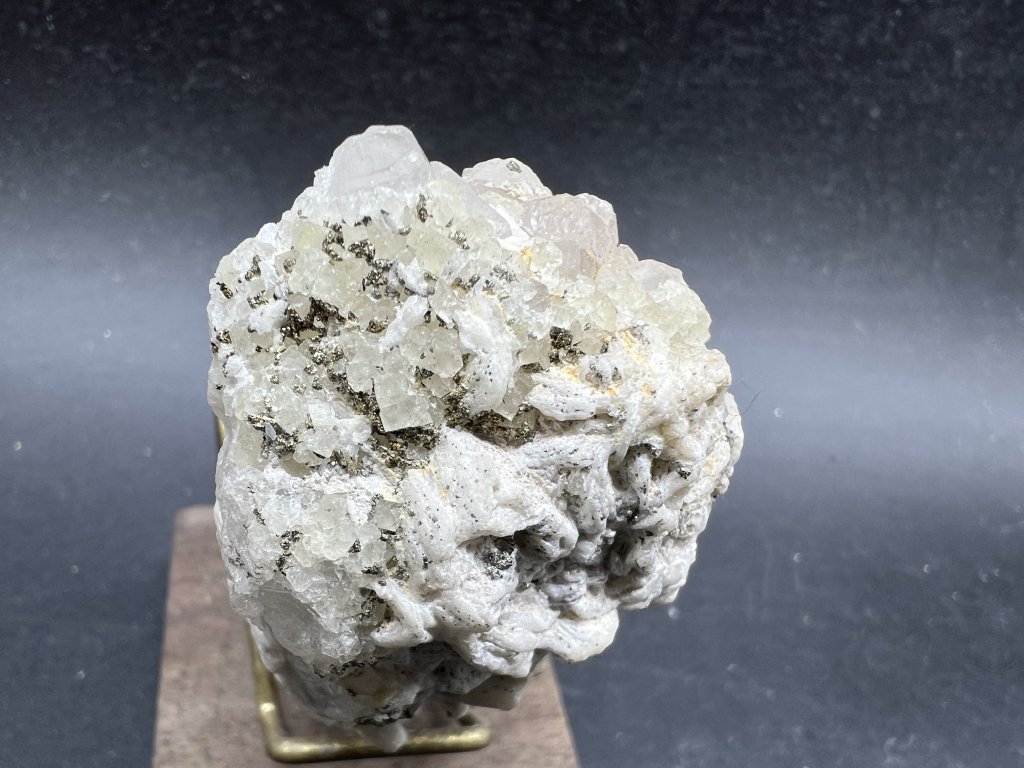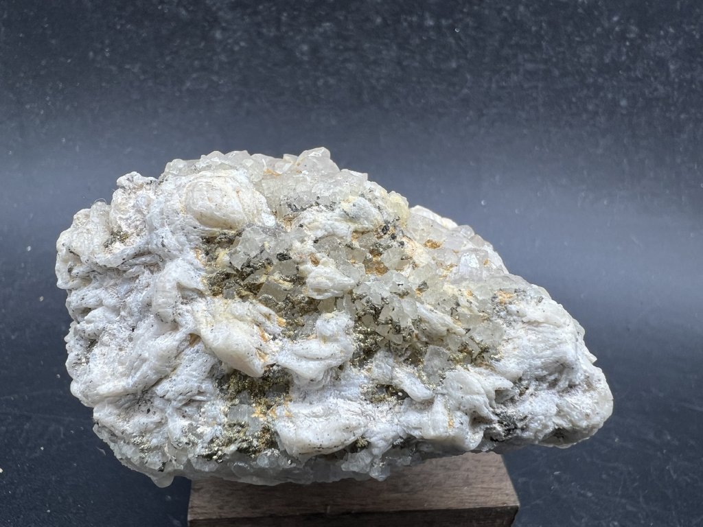 Ukázka minerálů z bývalého fluoritového dolu v Železných horách, kde těžba této suroviny byla definitivně ukončena v roce 1994. Na vzorku je baryt, pyrit, křemen a fluorit