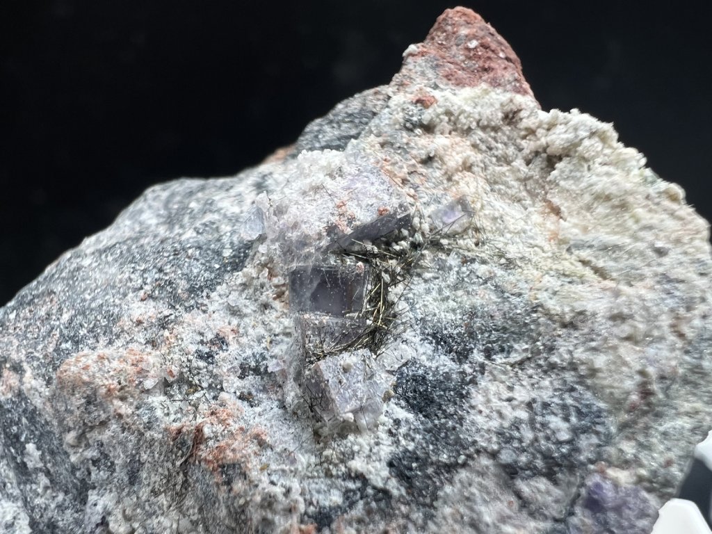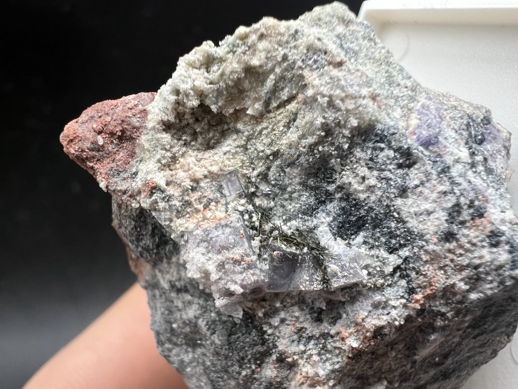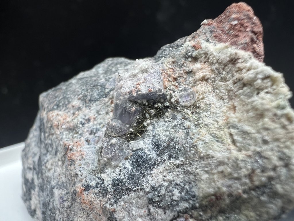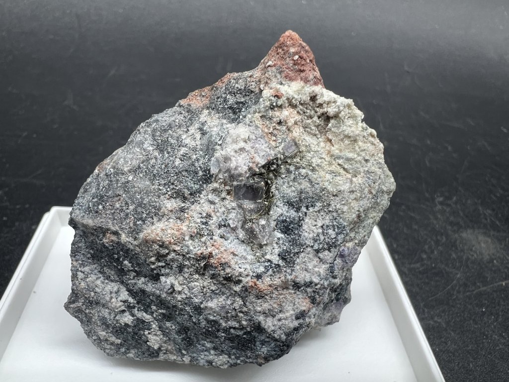 Vzorek Bismutinu u fluoritu ze štoly Barbora v Krupce. Vzorek je bezpečně umístěn v krabičce.