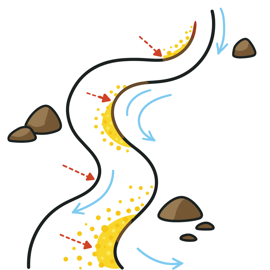 Po povodních zůstávají náplavové vrstvy štěrku, písku a drobných kamínků. Ty často obsahují jemné zlatinky. Zkus kopnout až dolů – zlato bývá u tvrdého podloží.