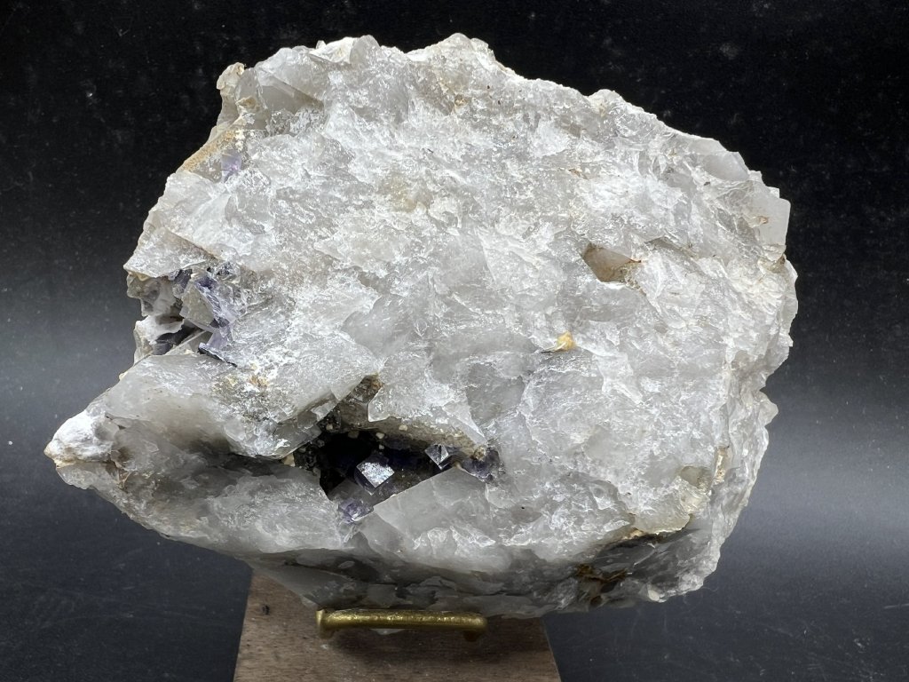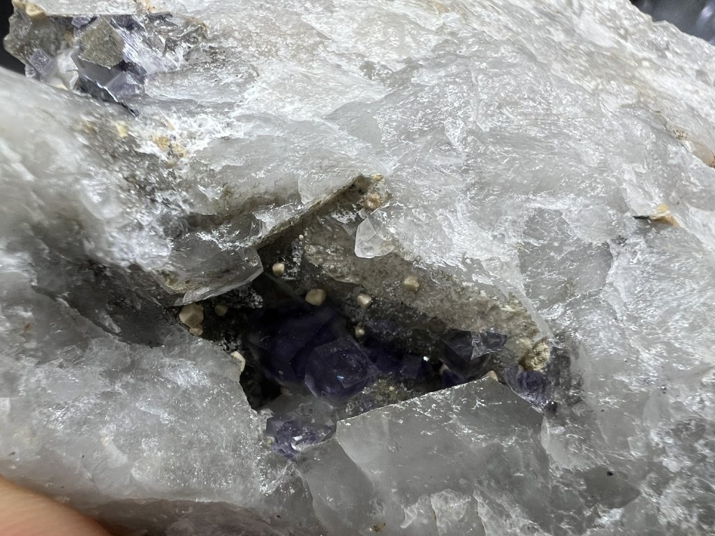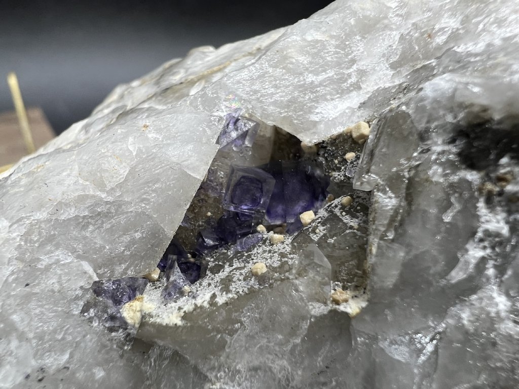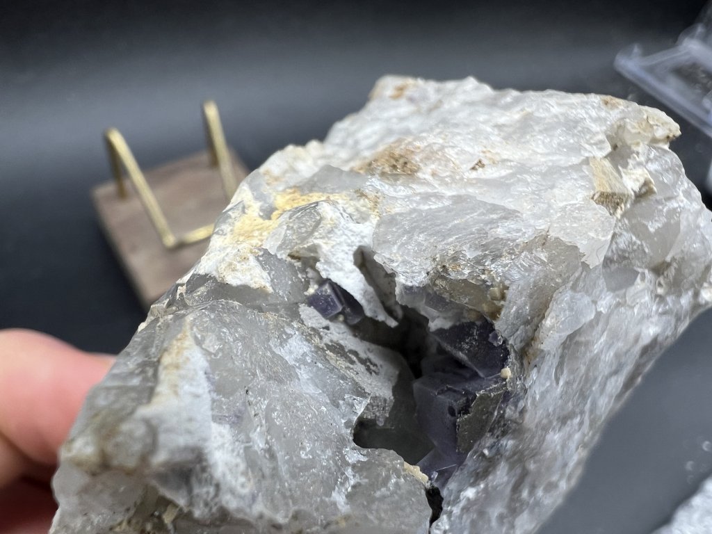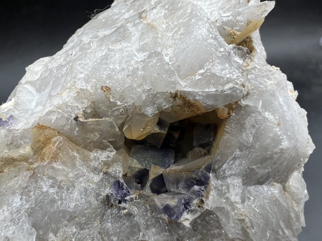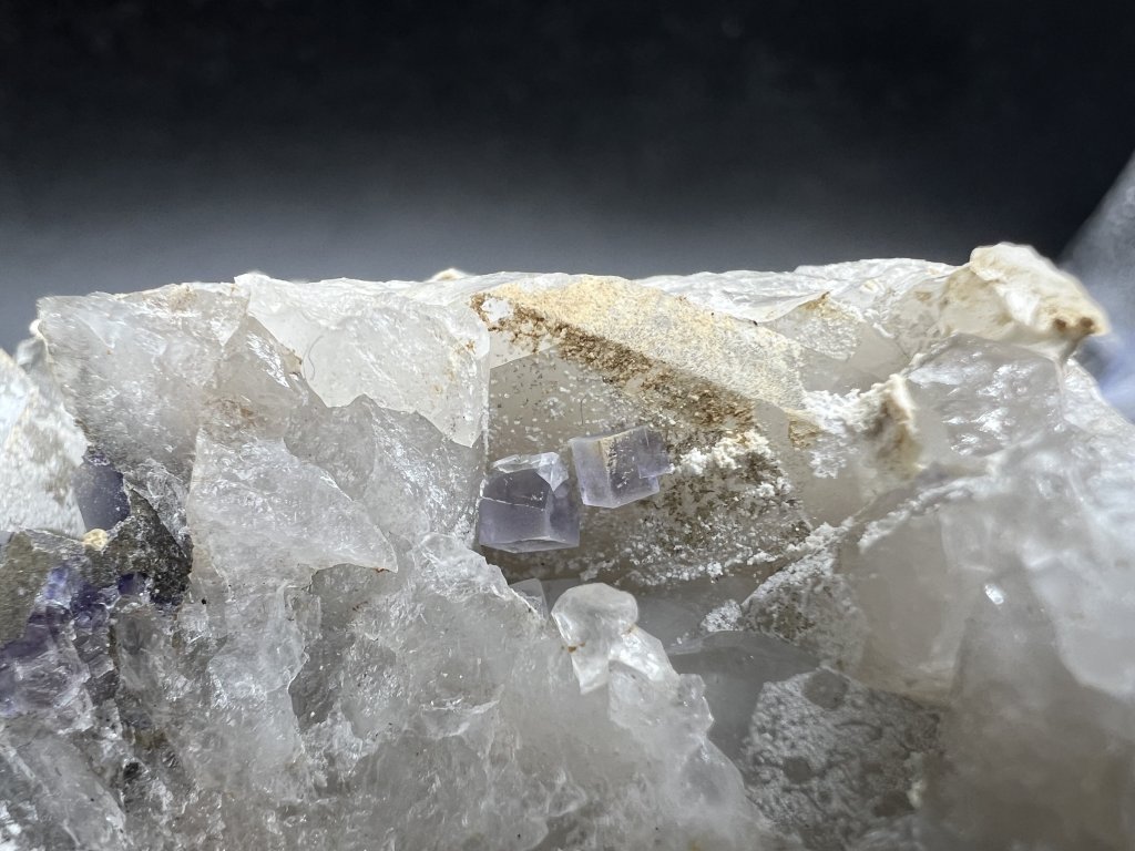 Vzorek fluoritu spolu s dolomitem z lokality Krupka v Krušných horách. Na vzorku je několik menších dutinek s fluoritem a dolomitem.