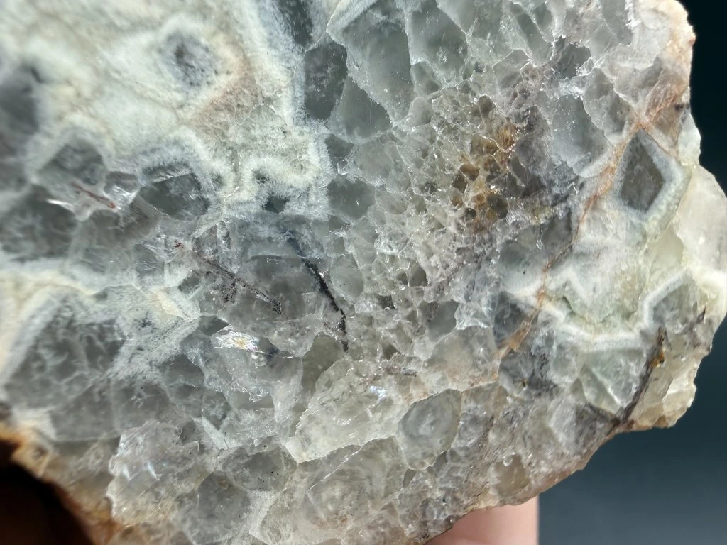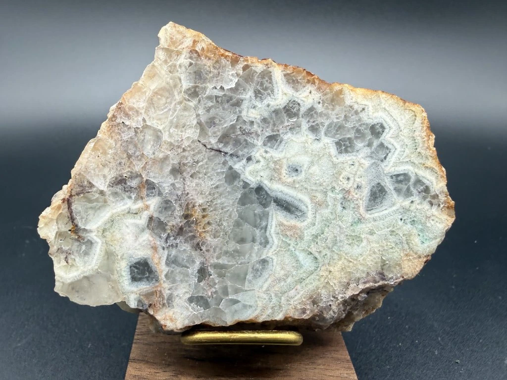 Ukázka leštěného fluoritu z nejmenšího těženého fluoritového ložiska v Čechách.
