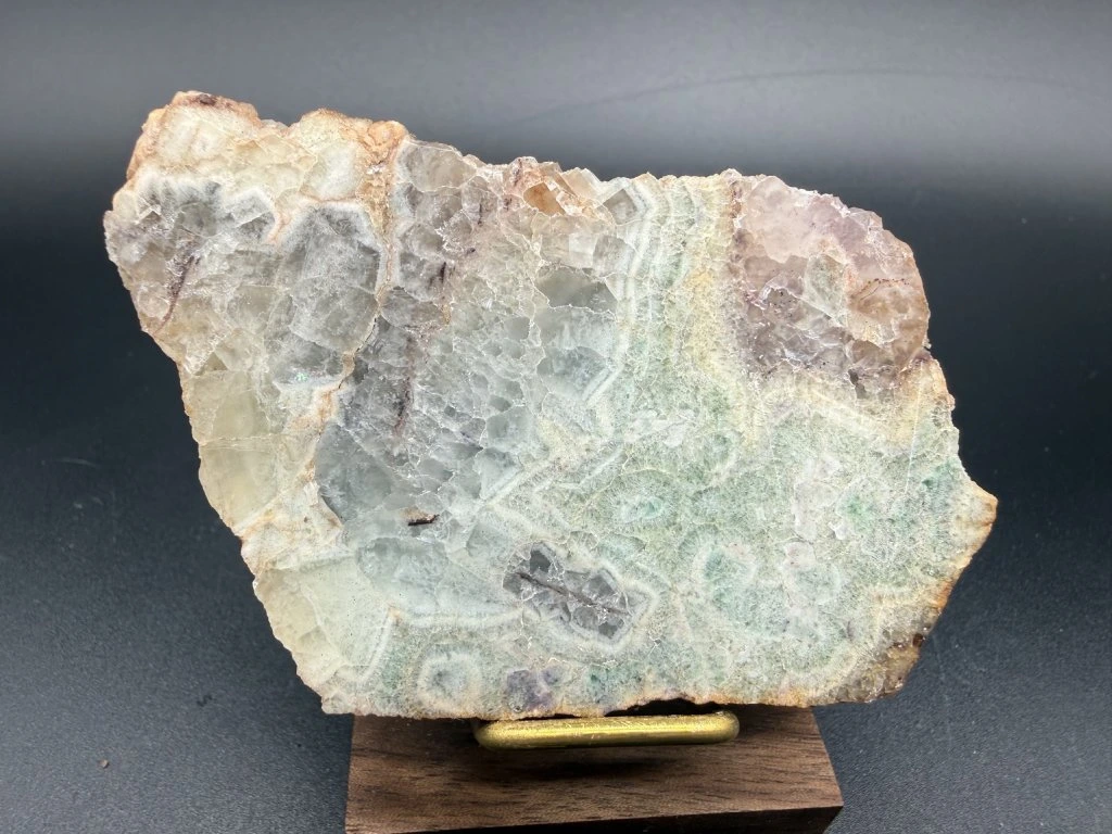 Ukázka leštěného fluoritu z nejmenšího těženého fluoritového ložiska v Čechách.