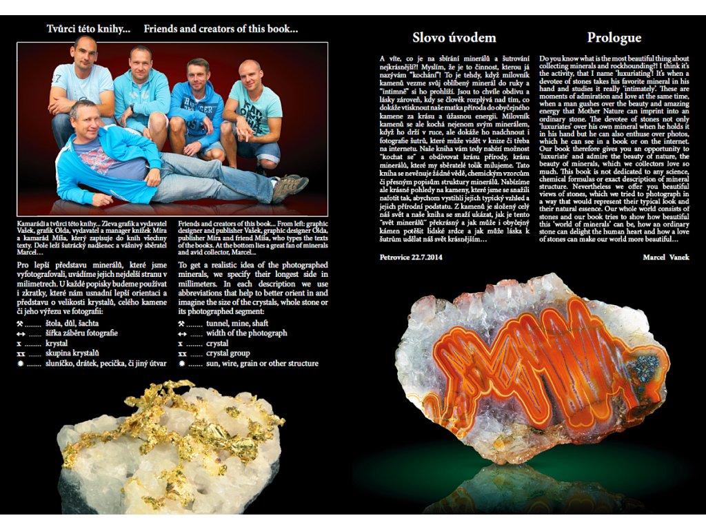 „Každého člověka, který se zajímá o minerály, nadchne v první řadě jejich neopakovatelná krása! Člověk nemusí být ani žádný vědec či mineralogický odborník, aby poznal, který kámen je krásný, zajímavý či výjimečný. Naše kniha GALERIE MINERÁLŮ je určena pro všechny milovníky kamenů, kteří chtějí obdivovat jedinečnou krásu minerálů. V knize najdete stovky fotografií ve vysoké ostrosti a v různých kompozicích. Nejdříve budeme obdivovat krásu minerálů Čech, Moravy i Slovenska a pak se podíváme do celého světa … Většina minerálů pochází ze sbírky šutráckého nadšence Marcela Vaneka, který je také sám nafotil. Zveme vás tedy na prohlídku galerie minerálů, ve které se můžeme kochat krásou naší země, krásou, kterou vytvořila sama příroda …“