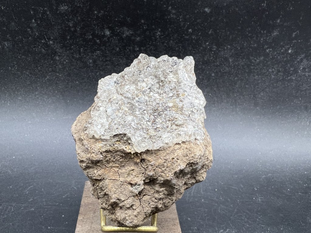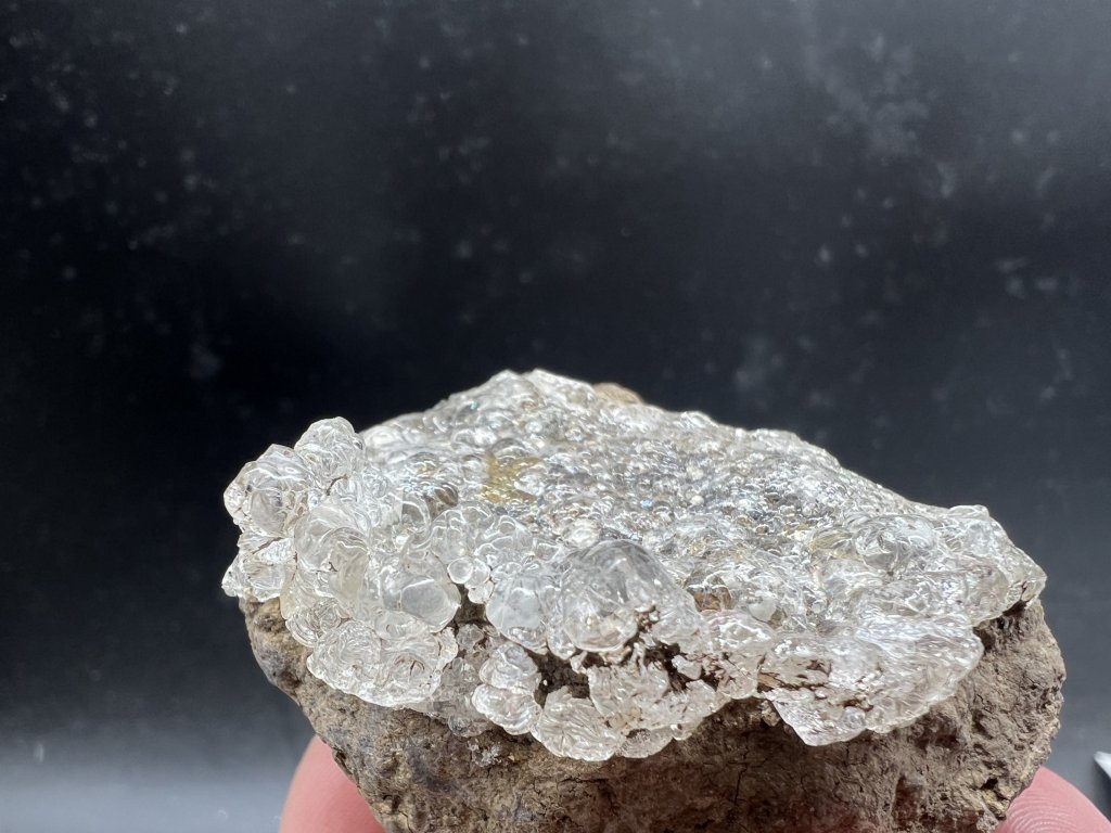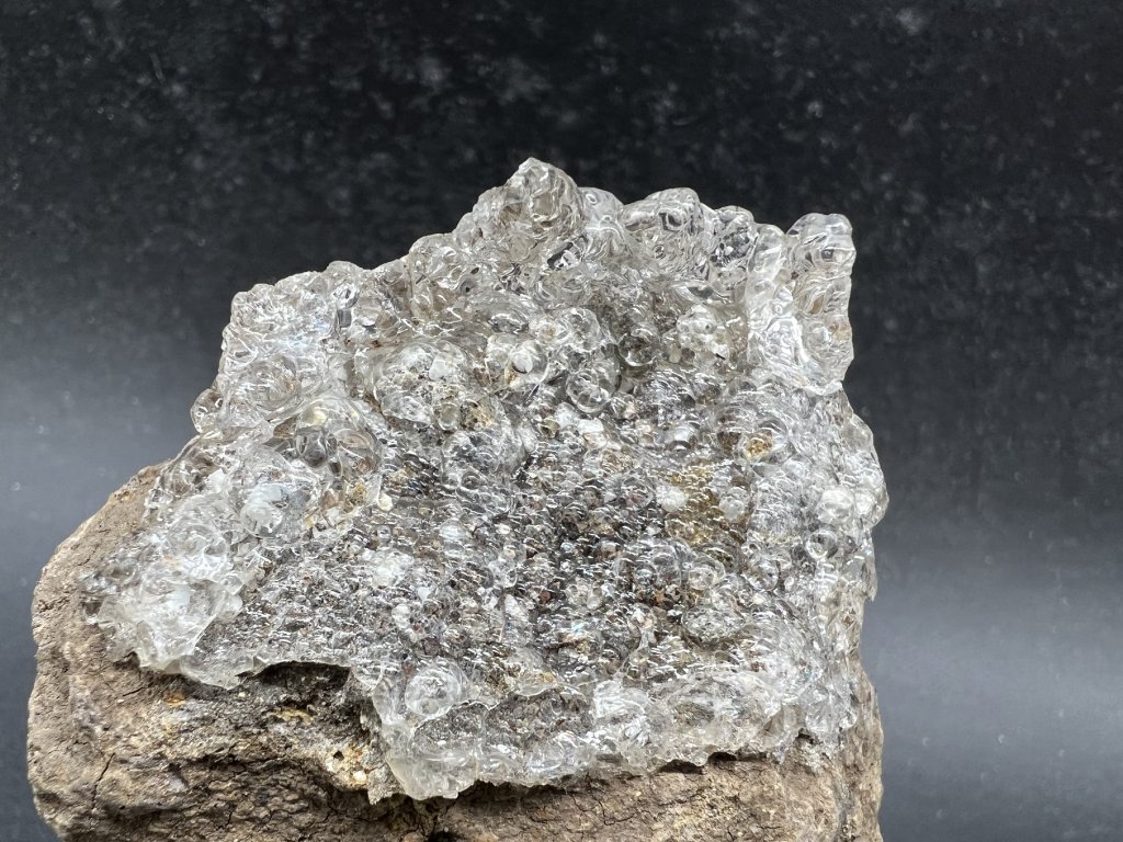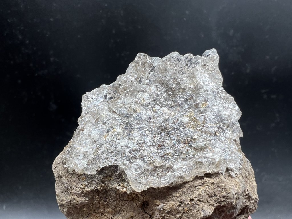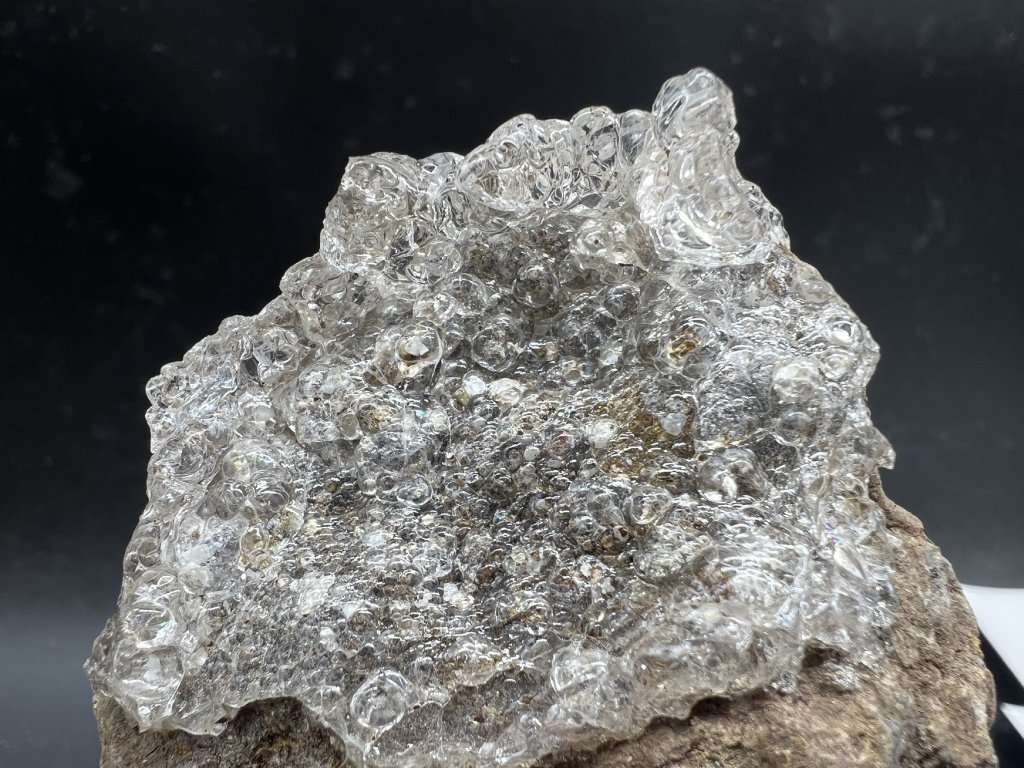 Ukázka čirého opálu - hyalitu narůstající na tefrit. Dále spolu s hyalitem je na vzorku několik bílý apatitů - staffelitu ve tvaru šestibokých sloupečků.