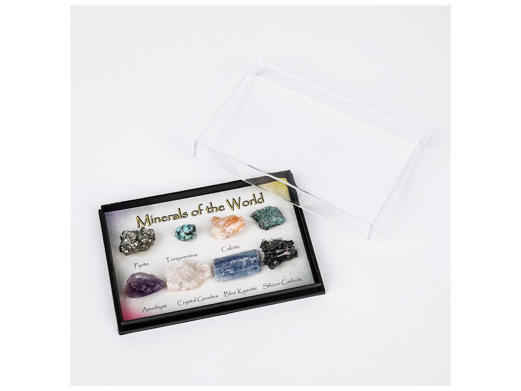 - Minerály jsou uloženy v elegantní plastové krabičce s praktickým odklápěcím víkem.