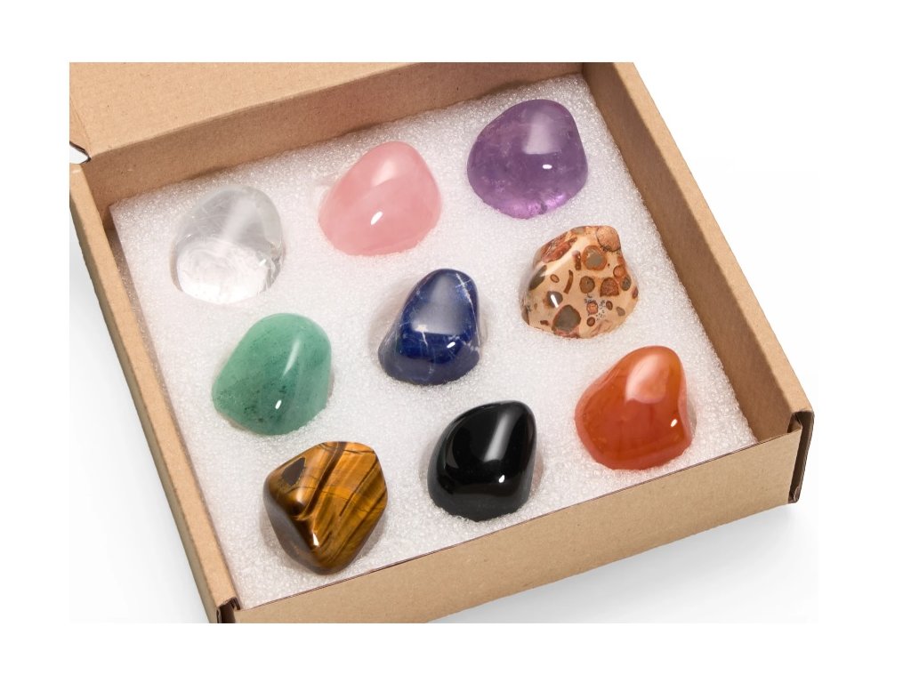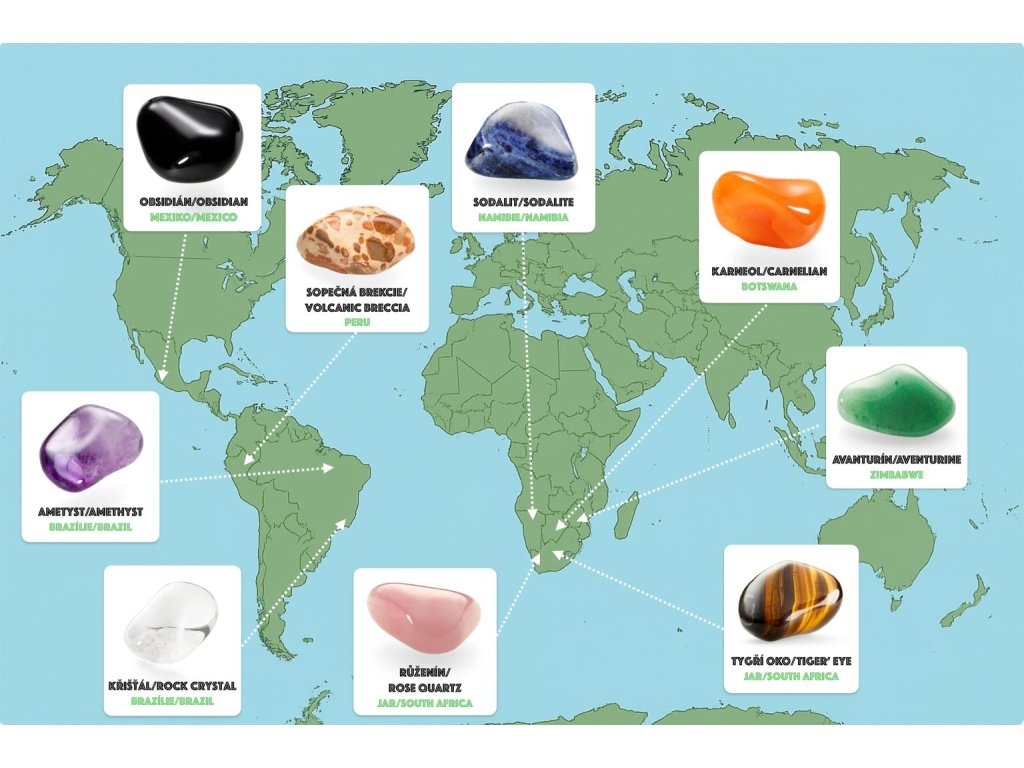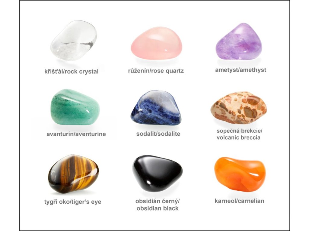 V sadě najdete tyto oblíbené druhy kamenů: křišťál, růženín, ametyst, avanturín, sodalit, sopečná brekcie, tygří oko, obsidián černý a karneol.