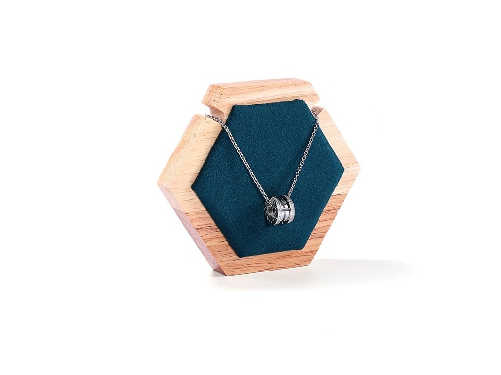 Stojánek má moderní šestiúhelník (octagon) tvar, který působí stylově a zároveň stabilně drží šperky na místě. Je vyroben z kvalitního dřevěného základu potaženého jemným materiálem, který pomáhá chránit šperky před poškozením a poškrábáním.
