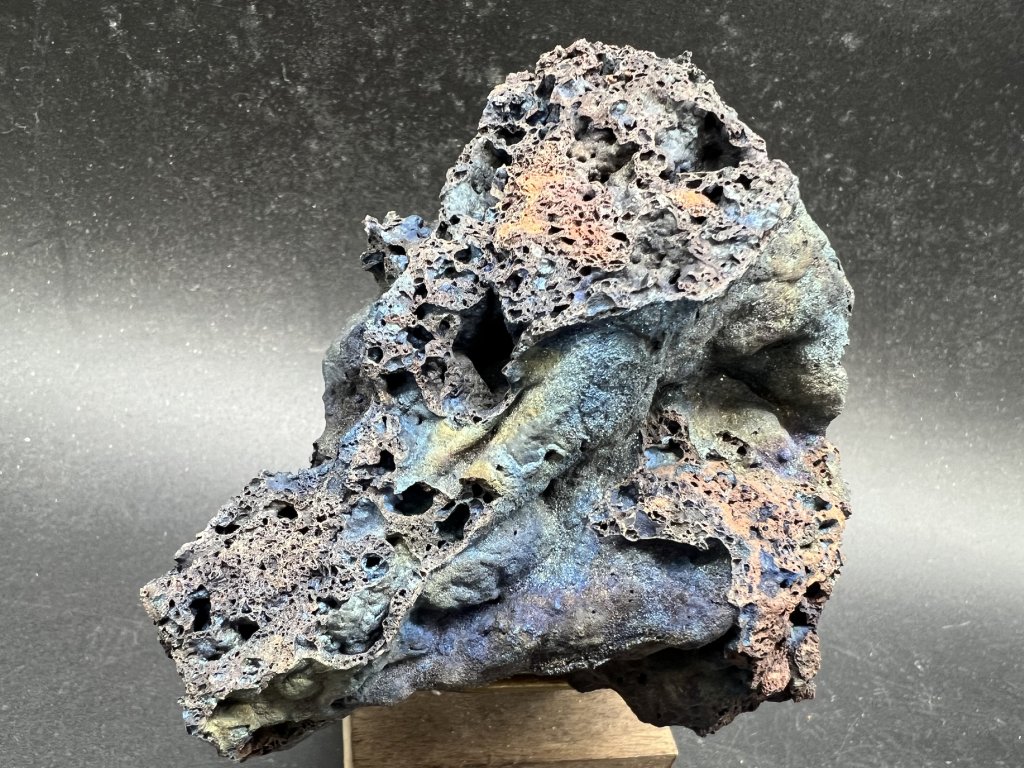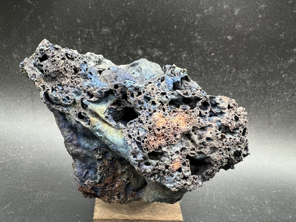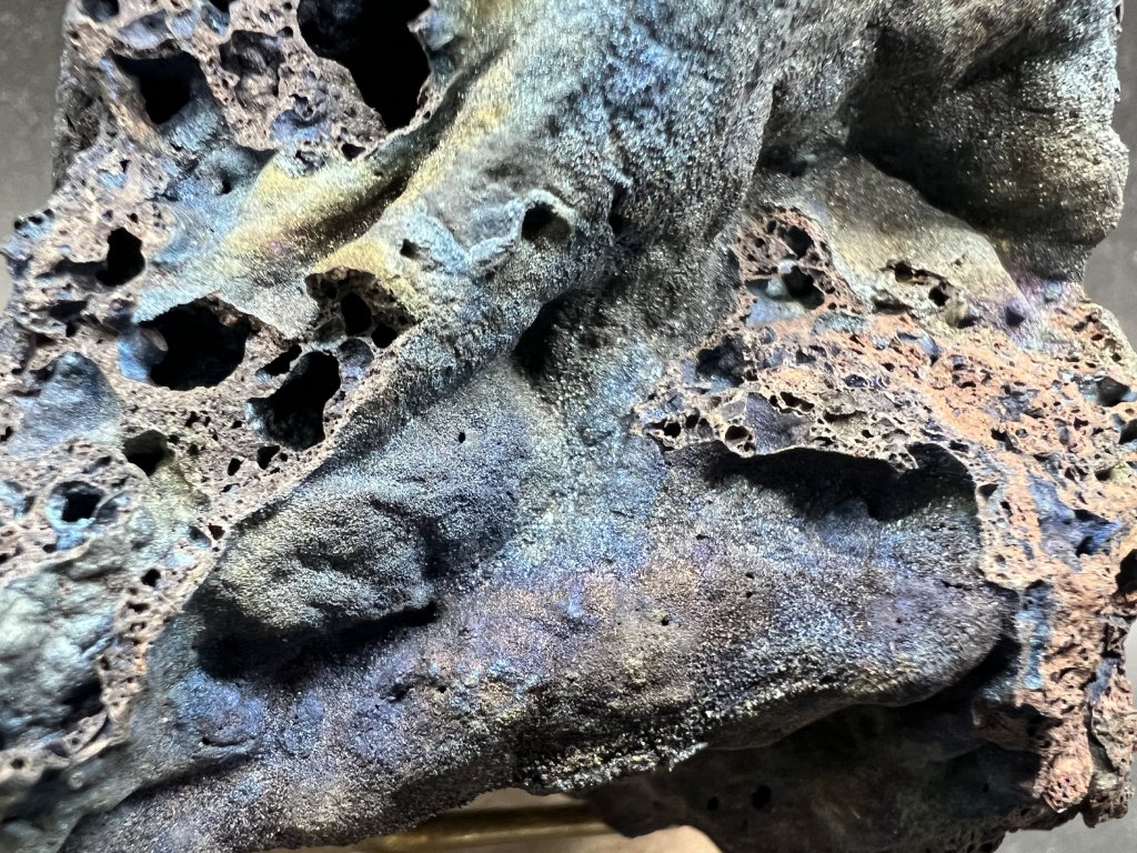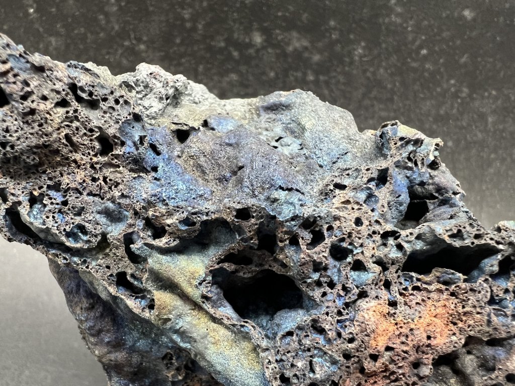Ukázka pestře naběhlé mikrokrystalické krusty hematitu na přírodní strusce.