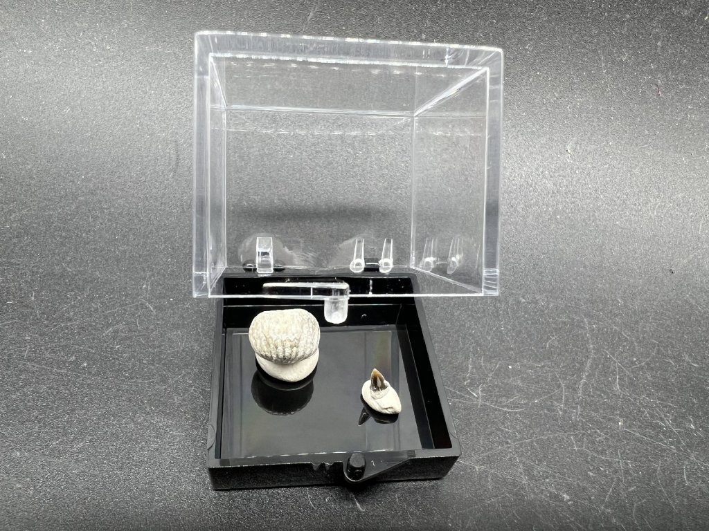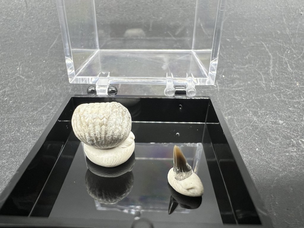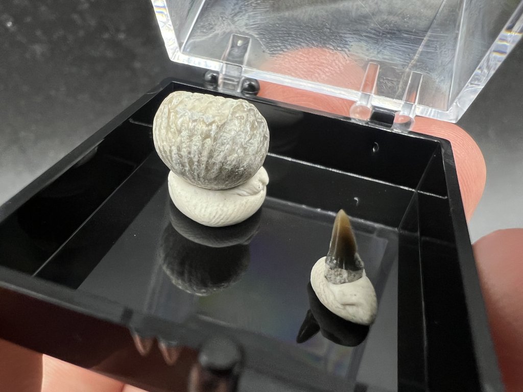 Ukázka žraločího zubu a brachiopoda (ramenonožce), nejspíše Orbirhynchia reedensis z lomu Úpohlavy.