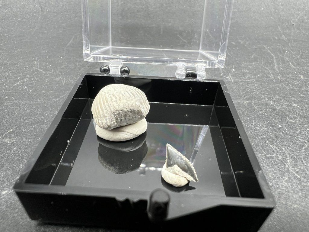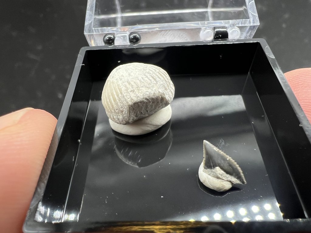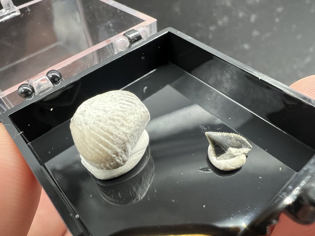 Ukázka žraločího zubu a brachiopoda (ramenonožce), nejspíše Orbirhynchia reedensis z lomu Úpohlavy.