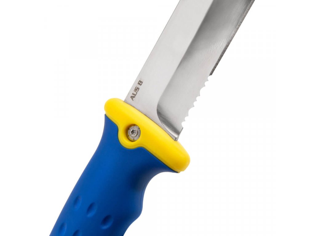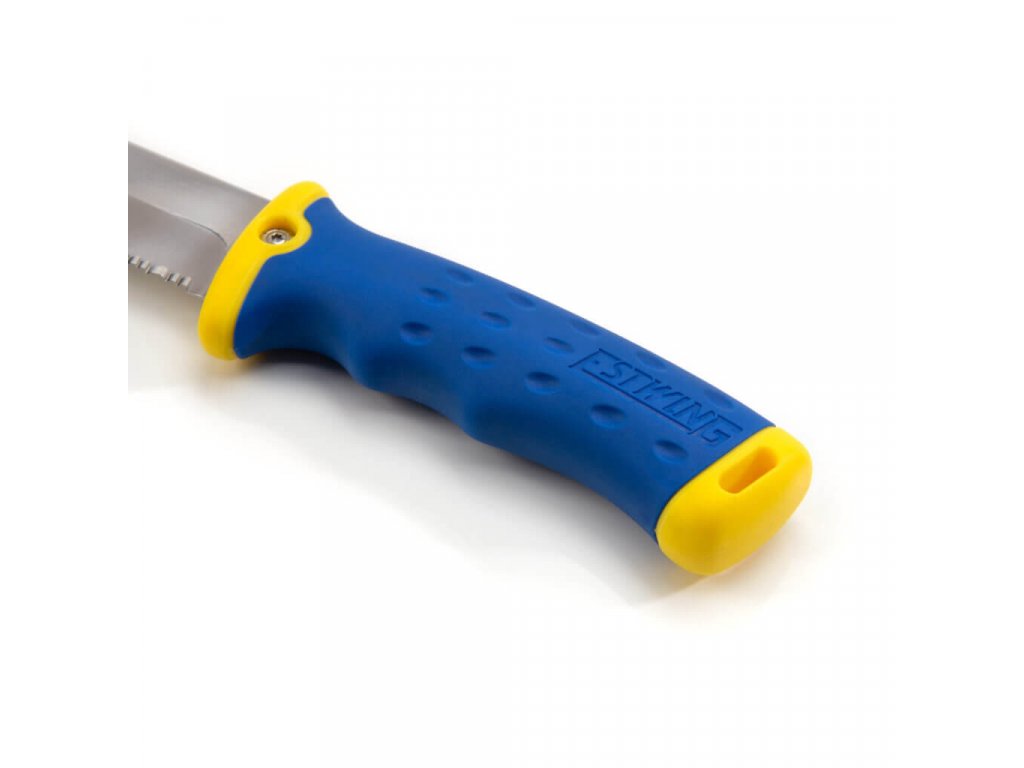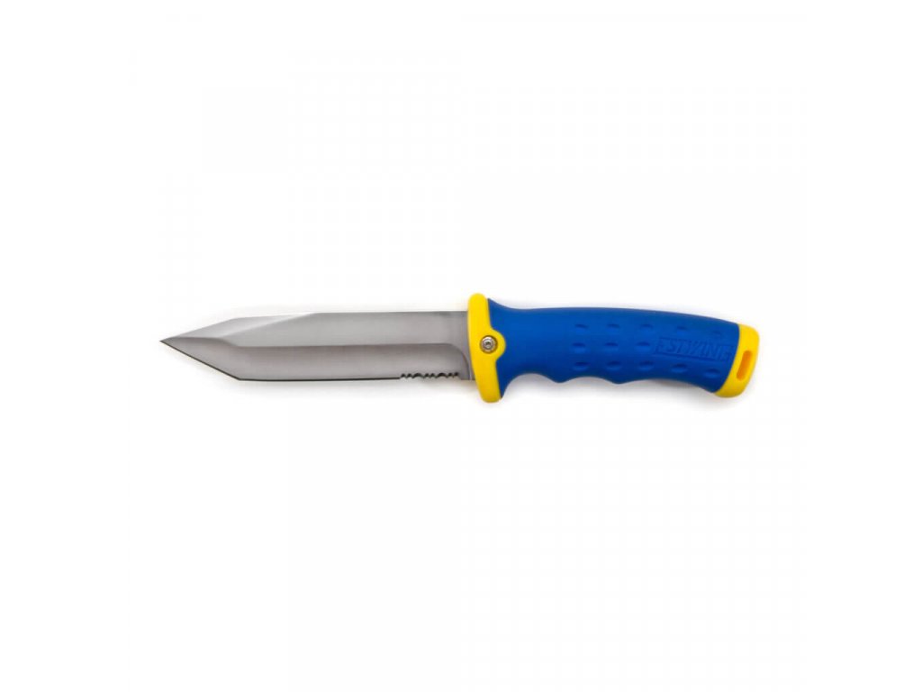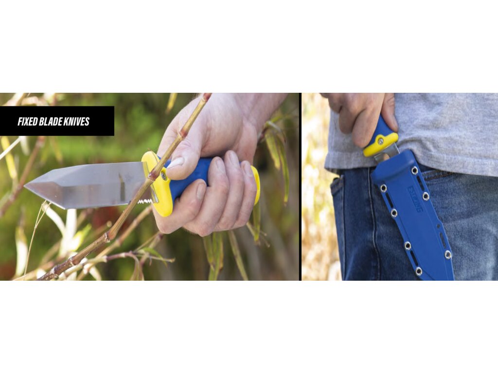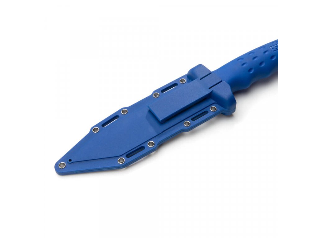 Odolná a robustní čepel s celoplošnou čepelí je vyrobena z nerezové oceli AUS-8, která tomuto noži dodává zlepšenou odolnost proti opotřebení a korozi spolu se zvýšenou odolností ostří a zároveň umožňuje snadné ostření v případě potřeby. Pohodlná a ergonomická rukojeť Estwing v modré a žluté barvě je vyrobena z vysoce viditelného polypropylenu a pryže TPR. Přiložené nylonové pouzdro má řadu vyztužených otvorů a výřezů, které umožňují přenášení vodorovně či svisle.