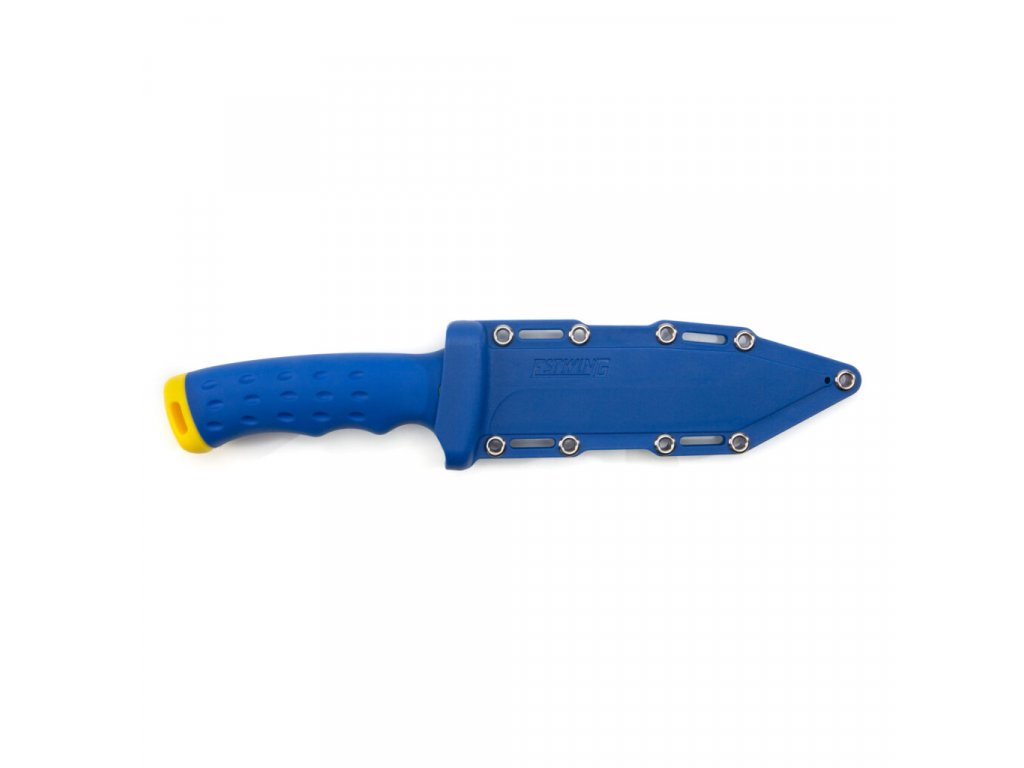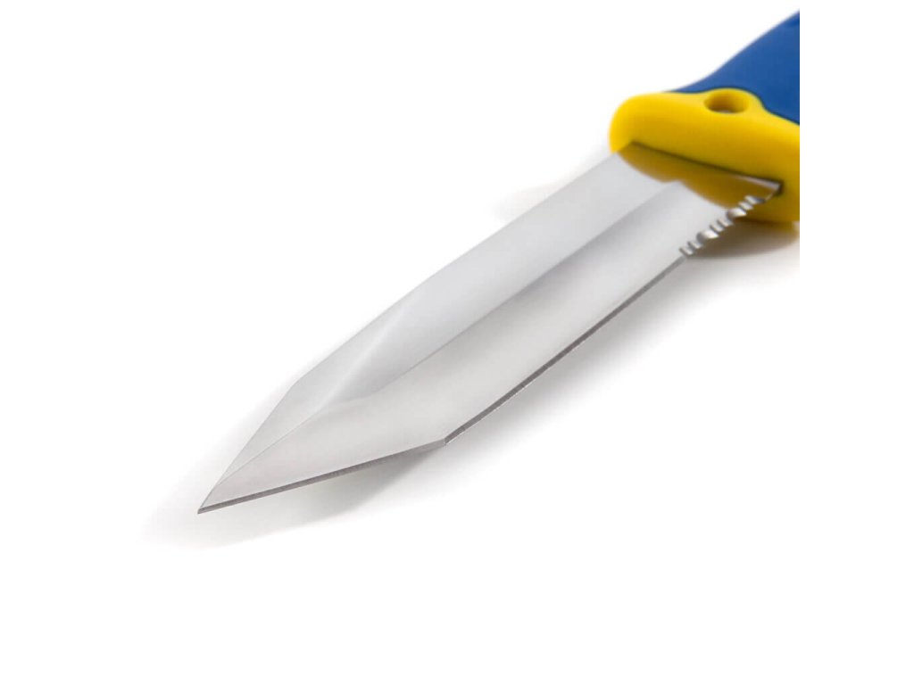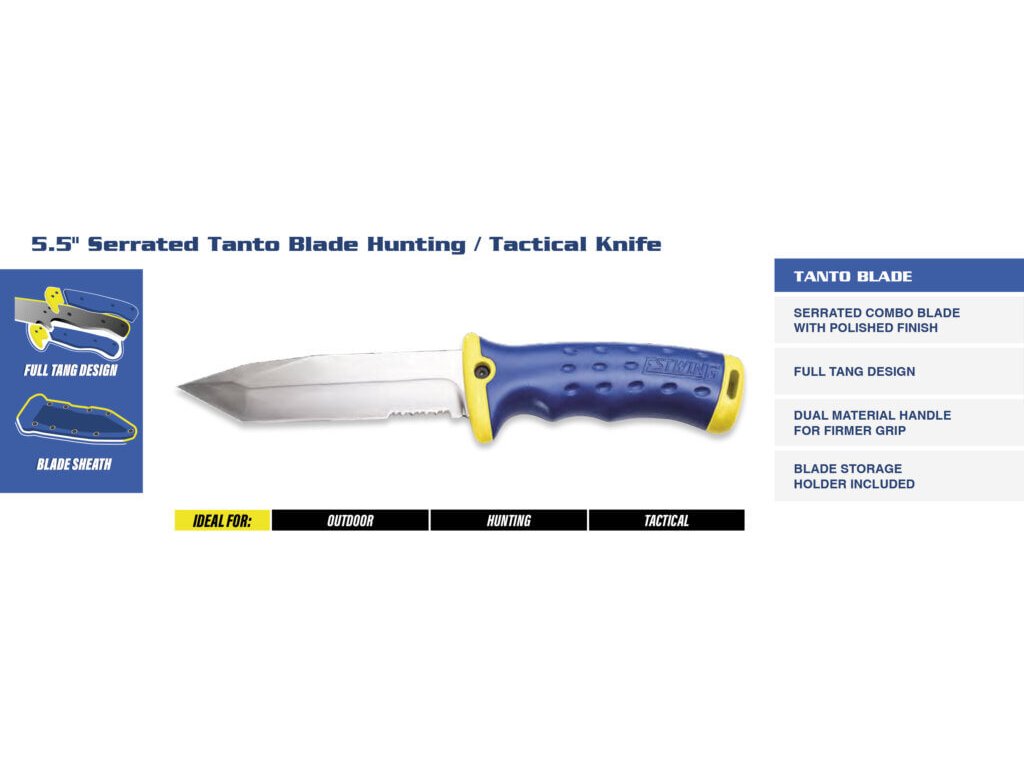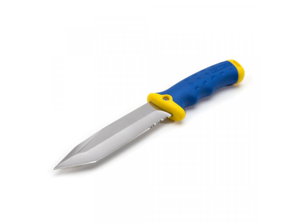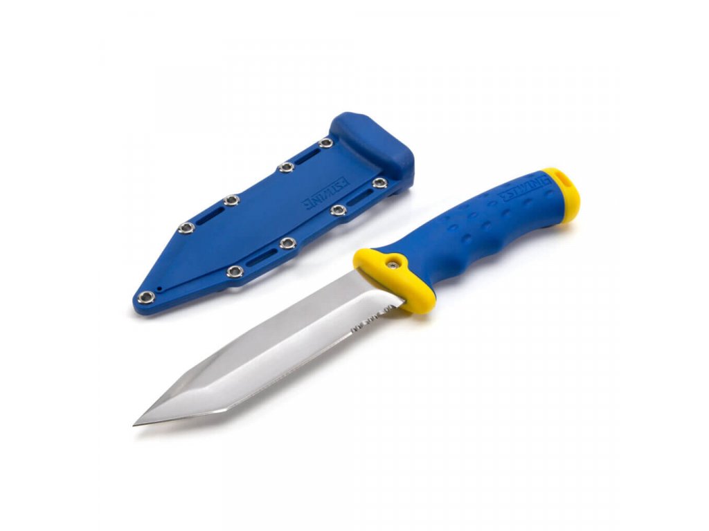 Odolná a robustní čepel s celoplošnou čepelí je vyrobena z nerezové oceli AUS-8, která tomuto noži dodává zlepšenou odolnost proti opotřebení a korozi spolu se zvýšenou odolností ostří a zároveň umožňuje snadné ostření v případě potřeby. Pohodlná a ergonomická rukojeť Estwing v modré a žluté barvě je vyrobena z vysoce viditelného polypropylenu a pryže TPR. Přiložené nylonové pouzdro má řadu vyztužených otvorů a výřezů, které umožňují přenášení vodorovně či svisle.